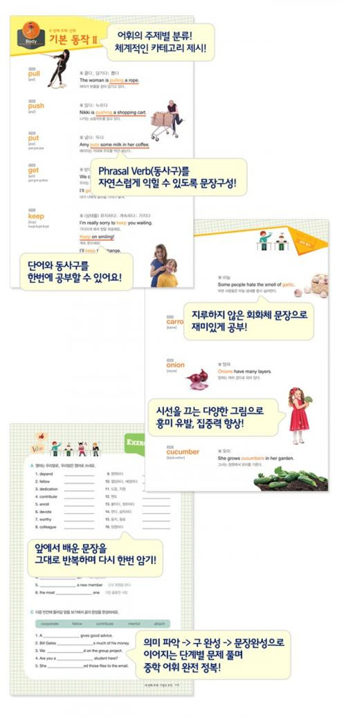중등 내신 대비로 2009 교과개정안을 충실히 반영하여 교과서 주요 문구, 표현, 빈출어 수록하고 중학 교과 컨텐츠를 적극 반영하고 실생활에서 흔히 쓰는 표현으로 가득 채운 실용적 예문 수록하였다. 주제별, 레벨별 필수 어휘 분류: 레벨 및 학년에 맞는 필수 어휘를 주제별로 분류해서 수록하고 이미지로 직관적 이해: 실용적 예문을 더 돋보이게 하는 재미있는 이미지 수록하였다. 체계적인 학습이 가능하도록 3단계 테스트 수록: 단어의 의미파악 → 구 완성 → 문장 완성하였고 선생님들을 위한 자동 출제 어휘 프로그램 제공한다.
